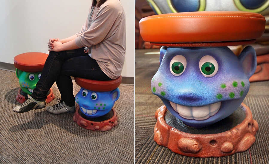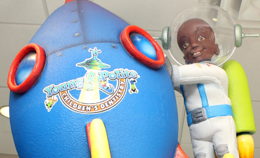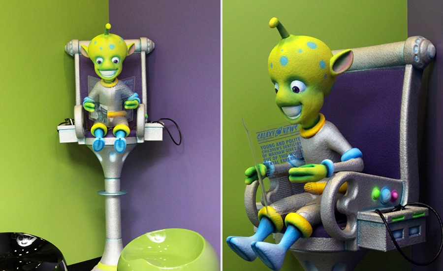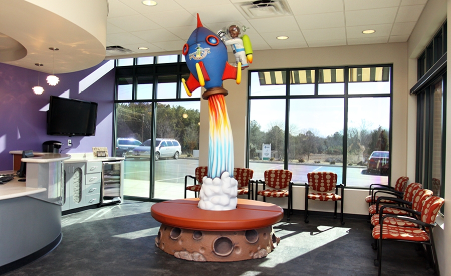 When they arrive at this office, patients are greeted by a colorful waiting room that features special rocket-themed seating. The little astronaut was carved to look like the son of the dentists who own this office, an extra touch to make this office special.