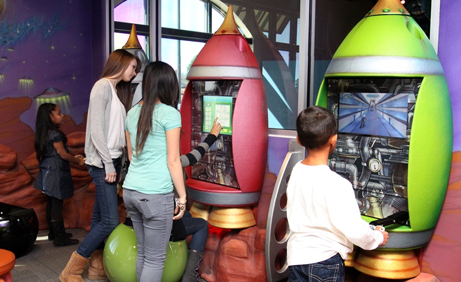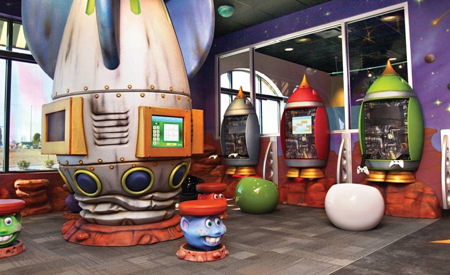 A games room boasts a crashed rocket ship with video consoles and alien stools that kids can use while playing. Several small rocketships on the wall provide additional video game systems.
