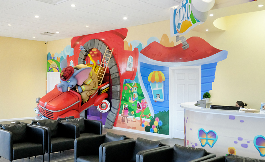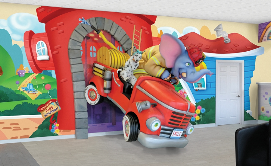 The waiting area has an amazing fire truck bursting through a sculpted rock arch with an elephant firefighter rushing a cute Dalmatian with a toothache to the dentist! This large and dynamic sculpture is sure to wow visitors and leave an impression long after appointments are over.