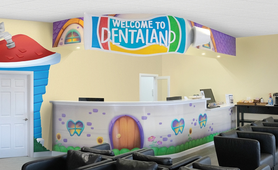 The reception desk has a mural applied that makes it look adorably rustic with a cute door and tooth-shaped window illustrations. Mounted above the reception desk is a custom welcome sign in the shape of a tube of toothpaste.