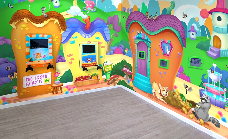 Throughout the office are mounted gaming tablets set against bright toon town murals that will keep kids and parents entertained and happy while waiting to be seen!
