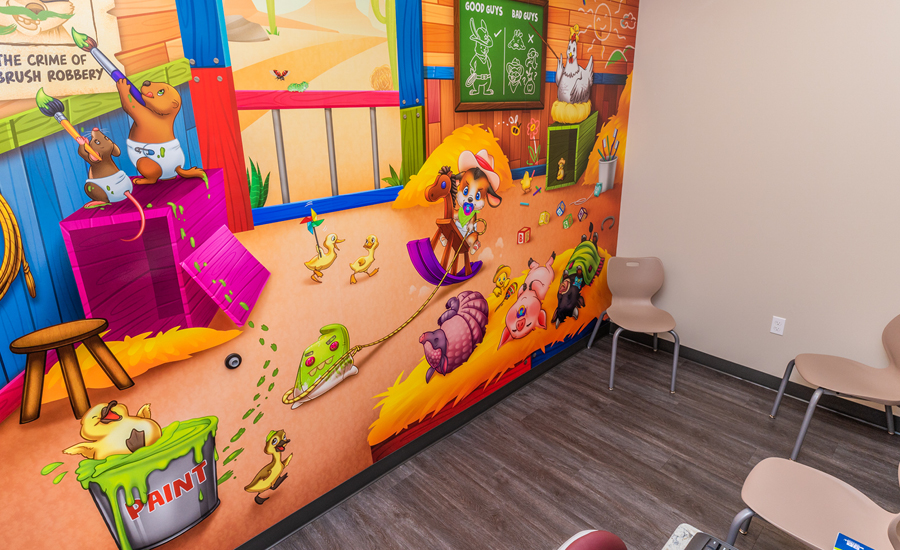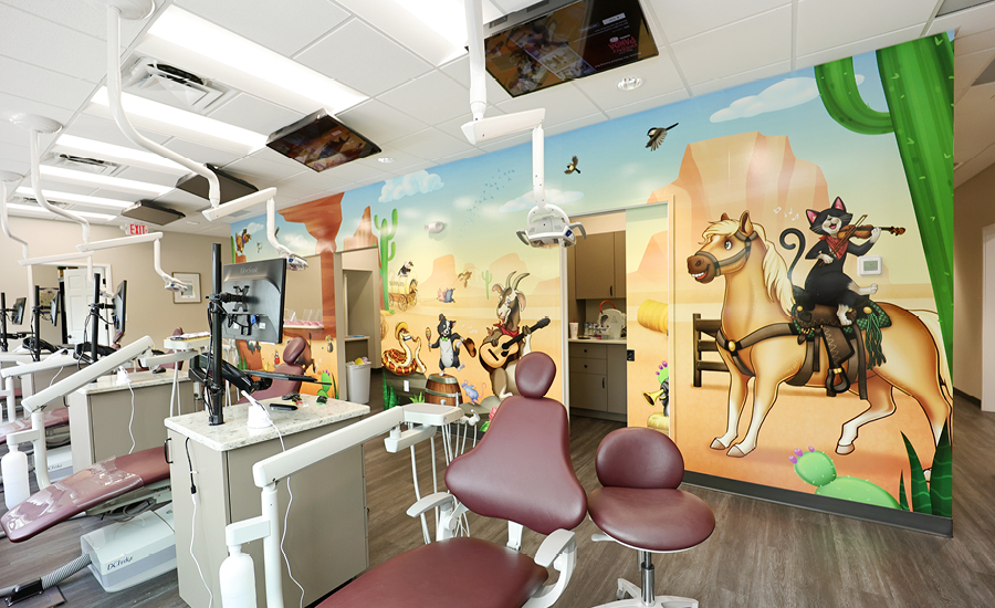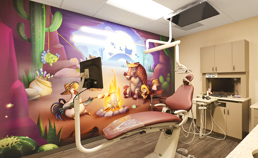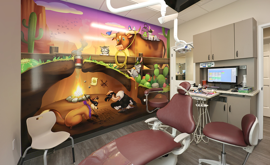But what really sets this office apart is it’s customized playful murals. They say a picture is worth thousand words, well these murals tell the tale of a thousand stories. They will have kids imagining they are toasting marshmallows with a harmonica playing armadillo, planning to hunt loot with fellow desperados, or saddling up to ride off into the sunset on a trusty steed. Ultimately with their imaginations busy at work the reality of their treatment, which can often be anxiety inducing, will be far from the forefront of their minds.
