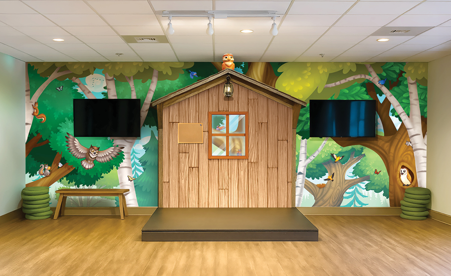 The presentation room became a charming forest clearing anchored by a sculpted stage-front treehouse. Vibrant treetop murals surround the room with owls, squirrels, and playful woodland creatures, giving the space an uplifting atmosphere for gatherings, lessons, and children’s events. Dual monitors blend seamlessly into the art, and a sculpted owl perched on the cabin roof adds a delightful 3D moment of surprise.