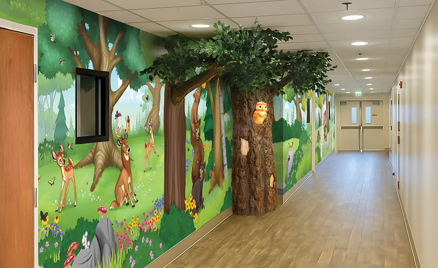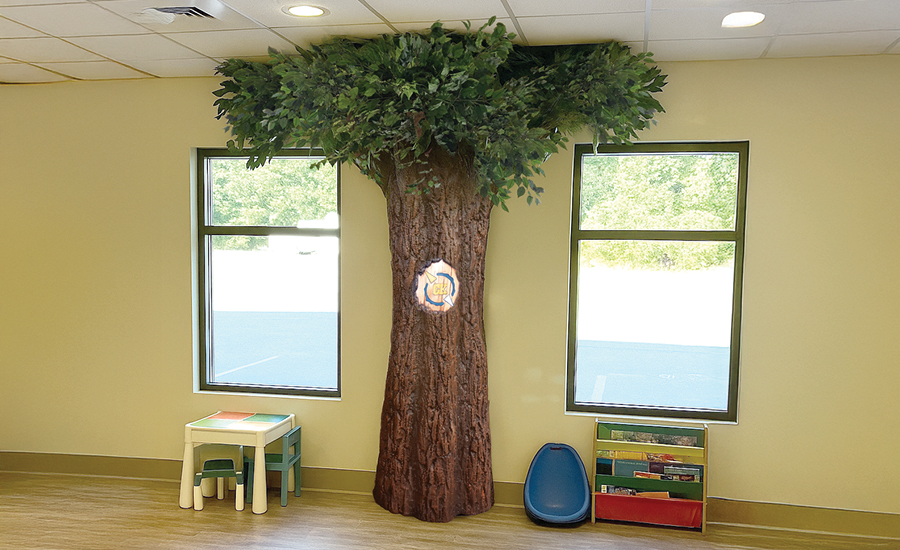 Long hallway corridors were transformed into a sun-dappled forest path. Trees, flowers, and friendly animals guide children toward their classrooms. A standout element is the sculpted tree integrated into the wall, featuring the church’s mascot in the trunk. Overhead branches extend across the ceiling, making the hallway feel like an enchanting woodland passage.