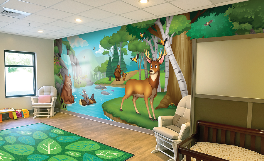 The church nursery room was designed as a peaceful, nature-inspired retreat perfect for infants and toddlers. Soft, friendly characters, including deer, birds, and smiling bears, fill a gentle riverside mural that wraps the room. The palette stays calming and cheerful, creating a soothing environment for families and volunteers alike. Small-scale furniture and play areas tie the whole space together.