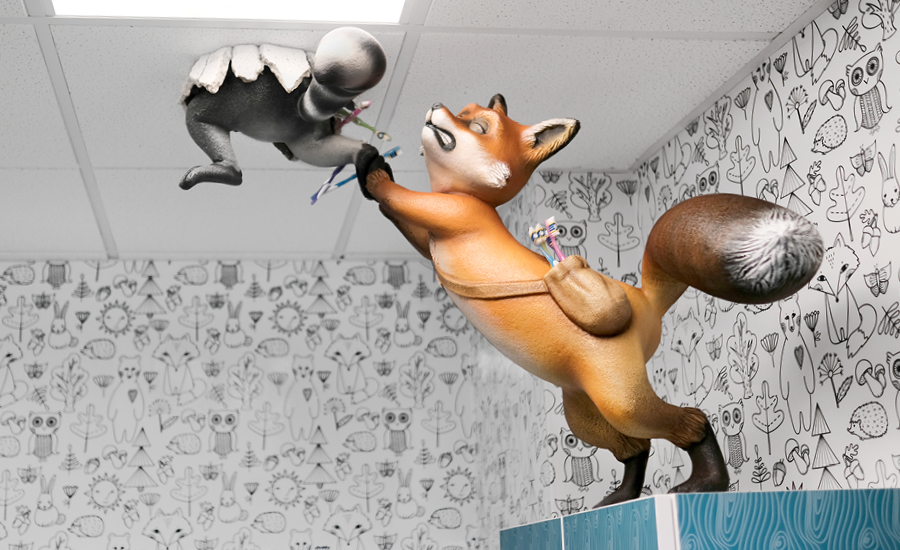 In the treatment area, there is a charming sculpture of a fox helping a racoon escape through the ceiling after helping himself to some toothbrushes! The fox is perched on top of one of the cabinets and definitely provides some entertainment for visitors in the treatment chair.