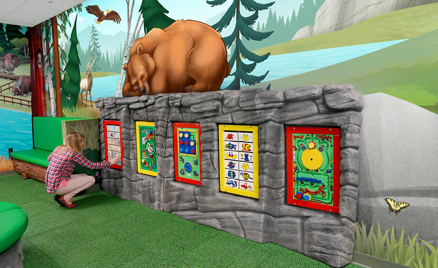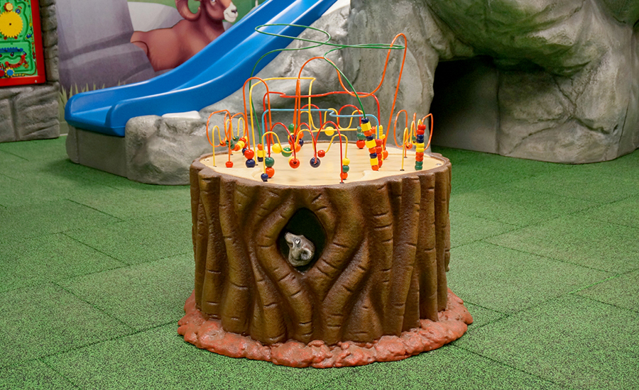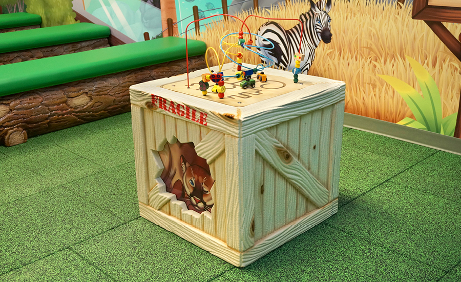The bead tables resemble crates with a mountain lion hidden inside plus a tree stump adorned by a friendly meerkat. These tables encourage hands-on exploration and creative play.