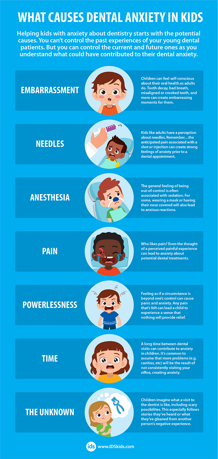Think about some of the reasons why your anxiety flares up as an adult. The fear of the unknown or remembering uncomfortable experiences are probably pretty big contributors, right? Kids have similar feelings, but coupled with big imaginations that can lead them to picture scenarios that create further fear and anxiety. An anxious child will also focus on previous stressful dental experiences, causing even more anxiety.